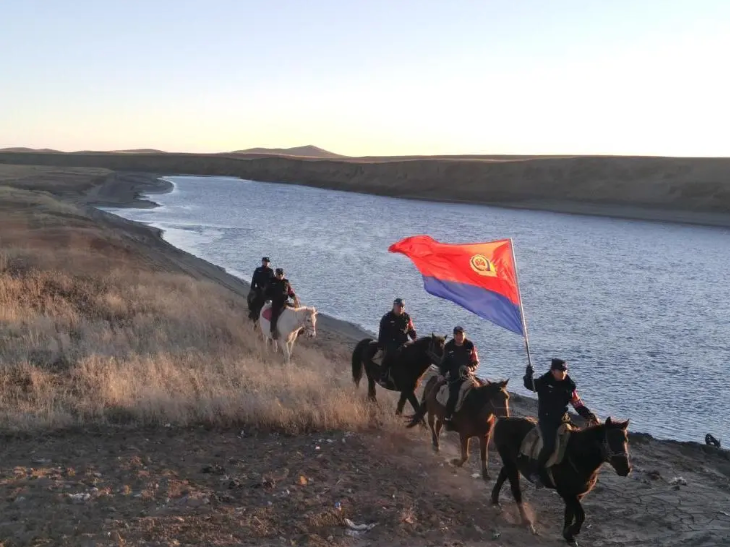 2023年11月,额旺格拉(右1)在若尔盖县麦溪乡黄河岸边的草原上巡逻守护生态环境。图片来源:四川公安